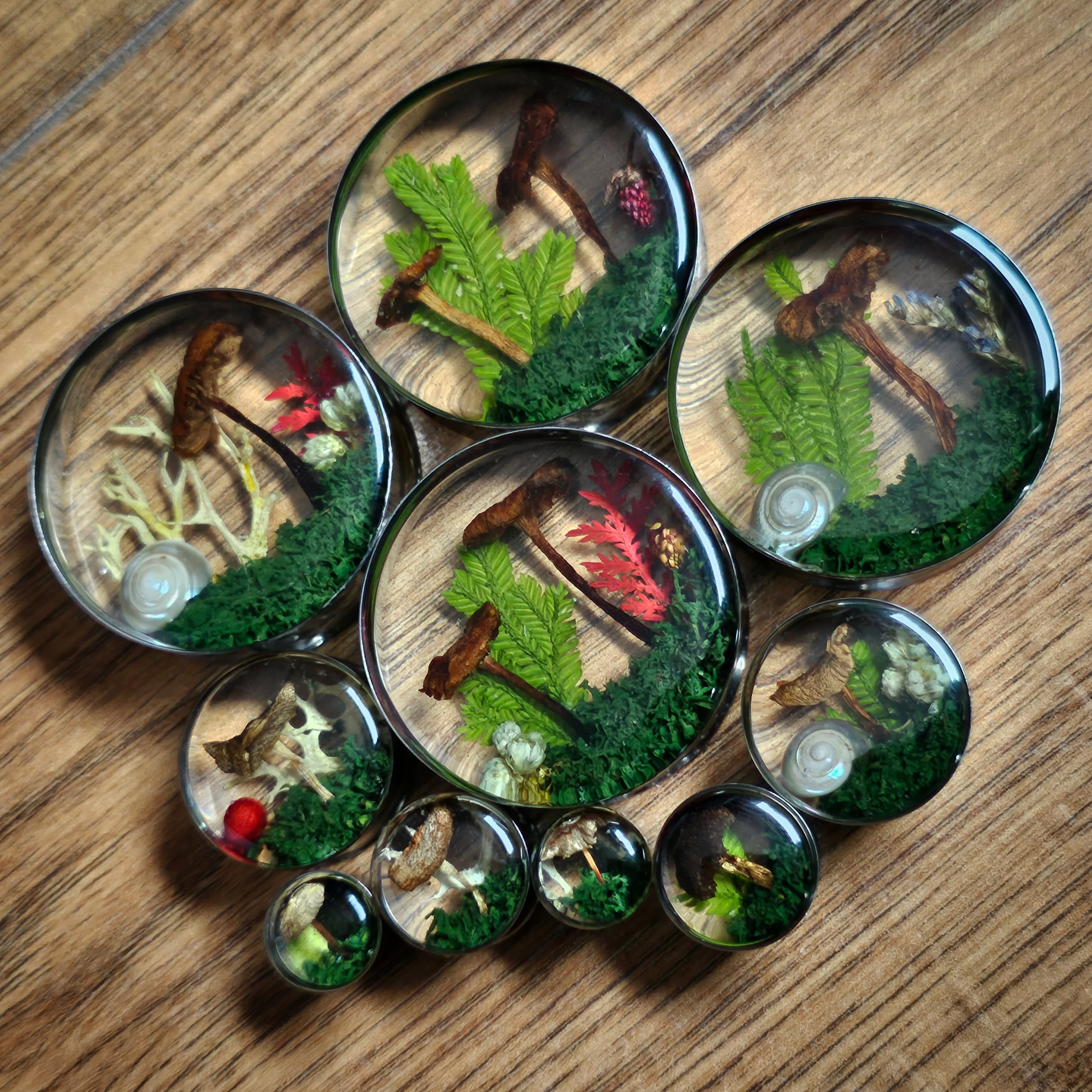 Enchanted forest, butterflies with real flowers and moss. Paper Butterfly in resin plugs, sizes 16mm and up.