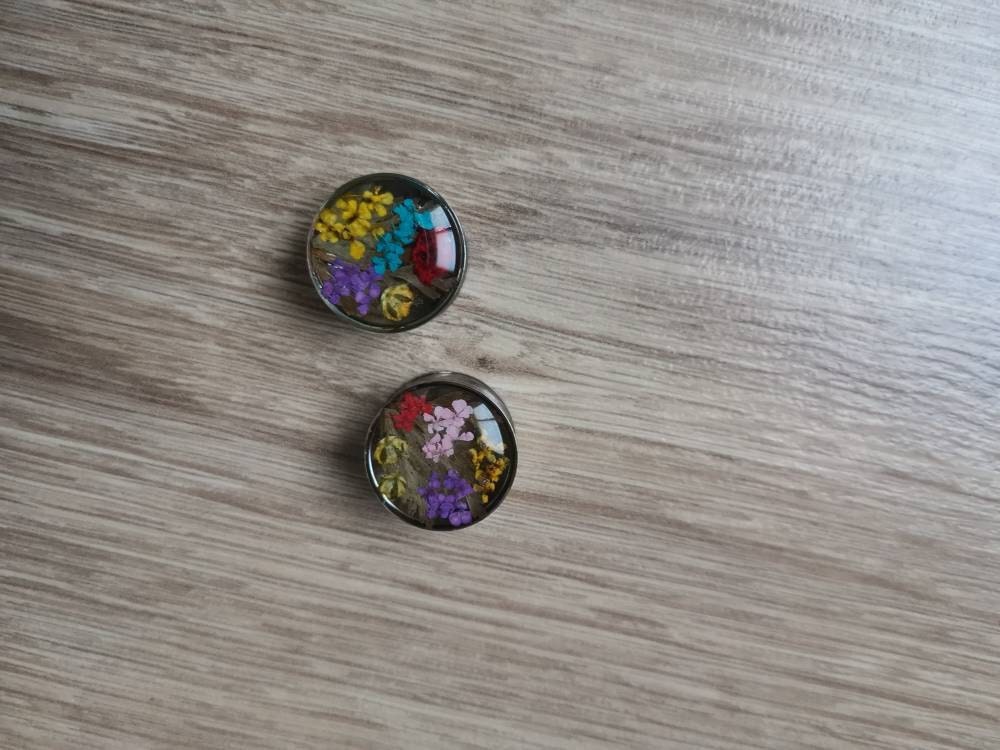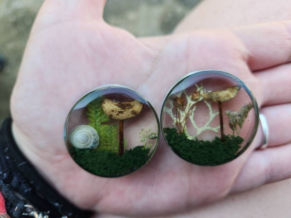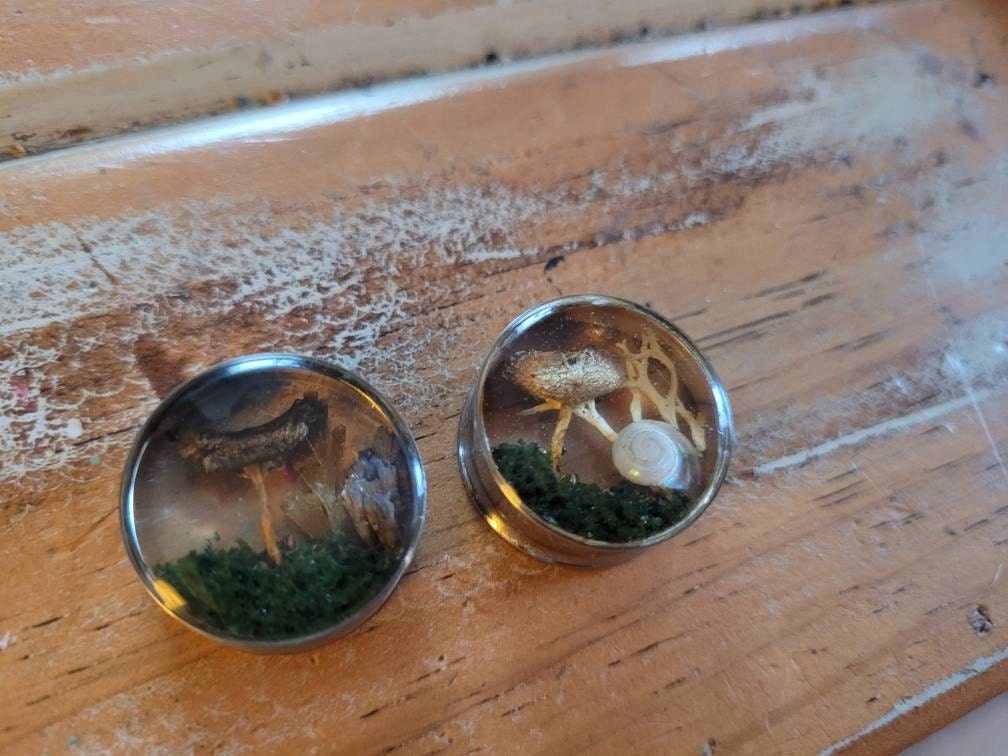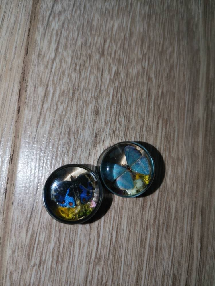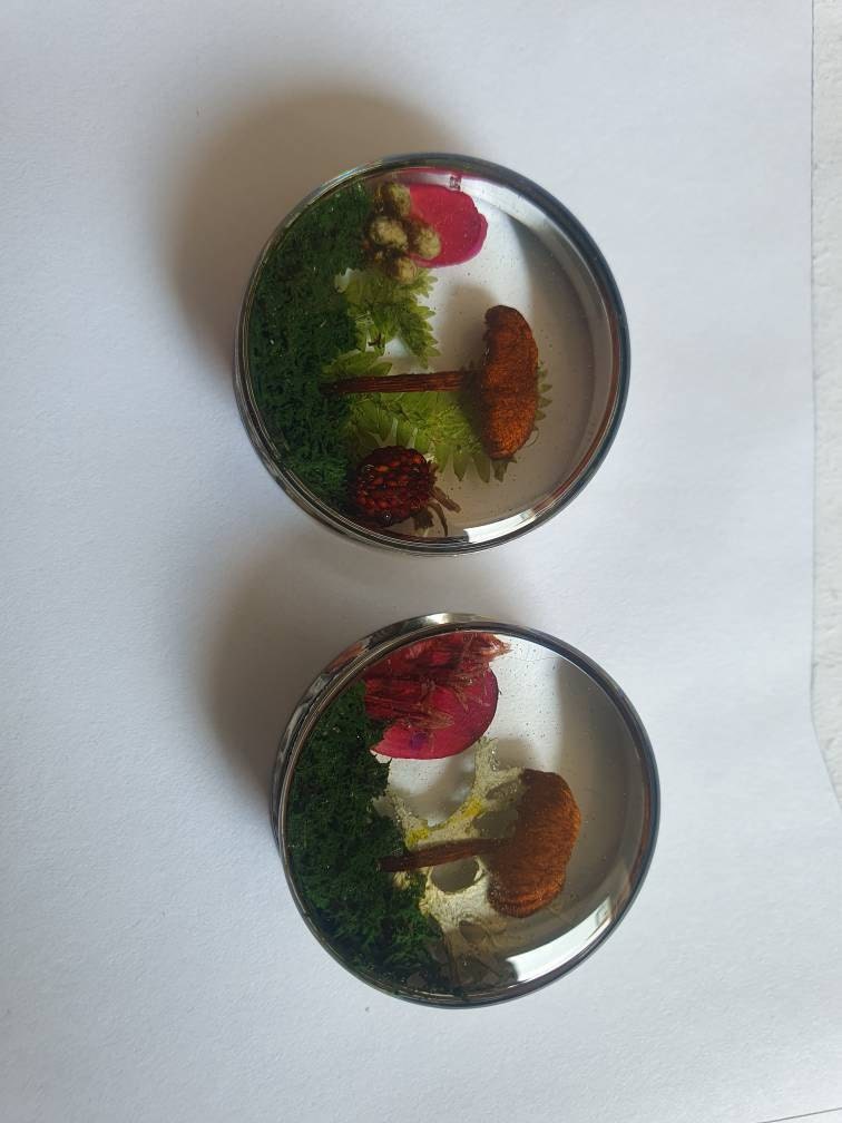Enchanted forest, butterflies with real flowers and moss. Paper Butterfly in resin plugs, sizes 16mm and up.