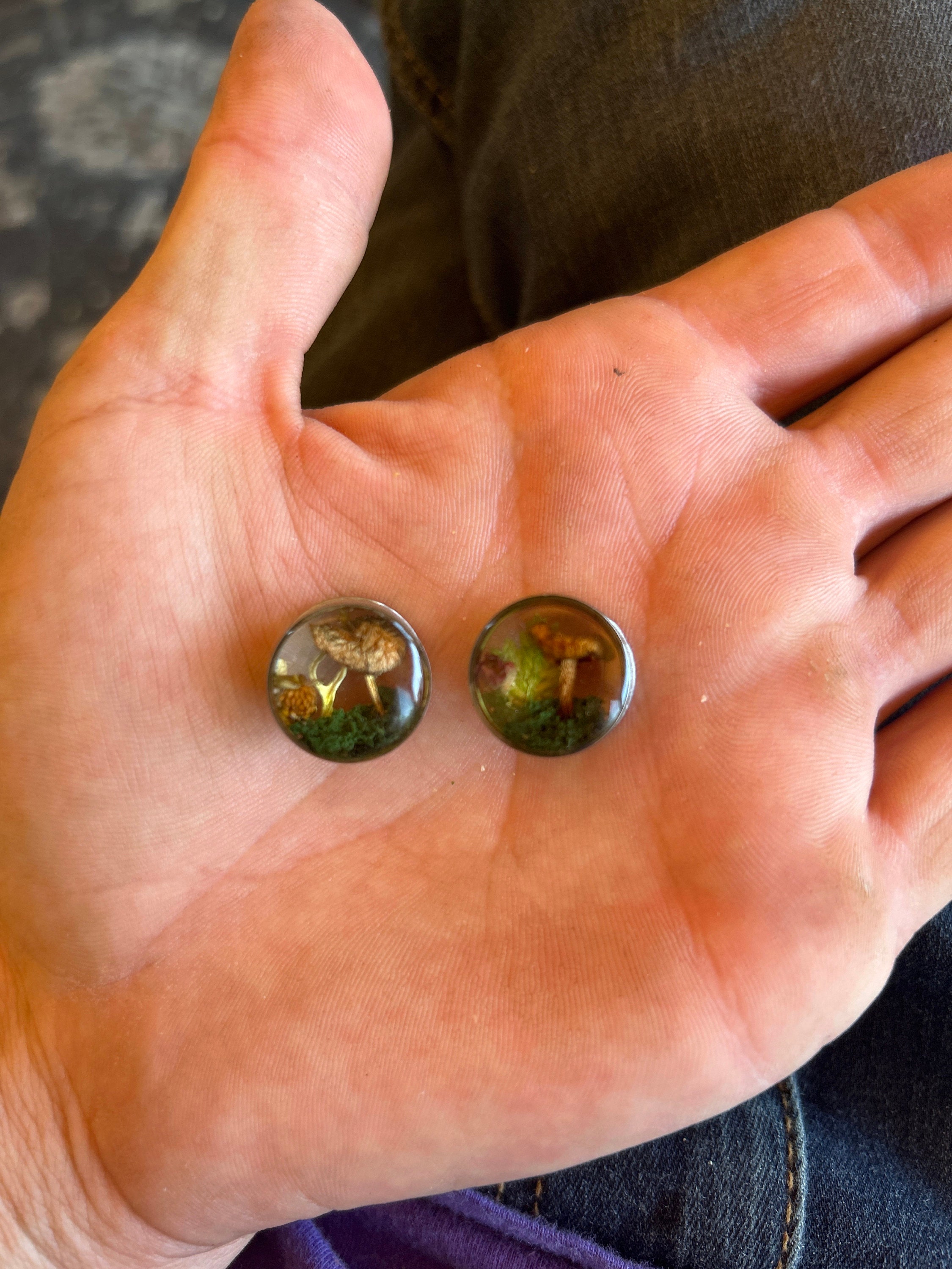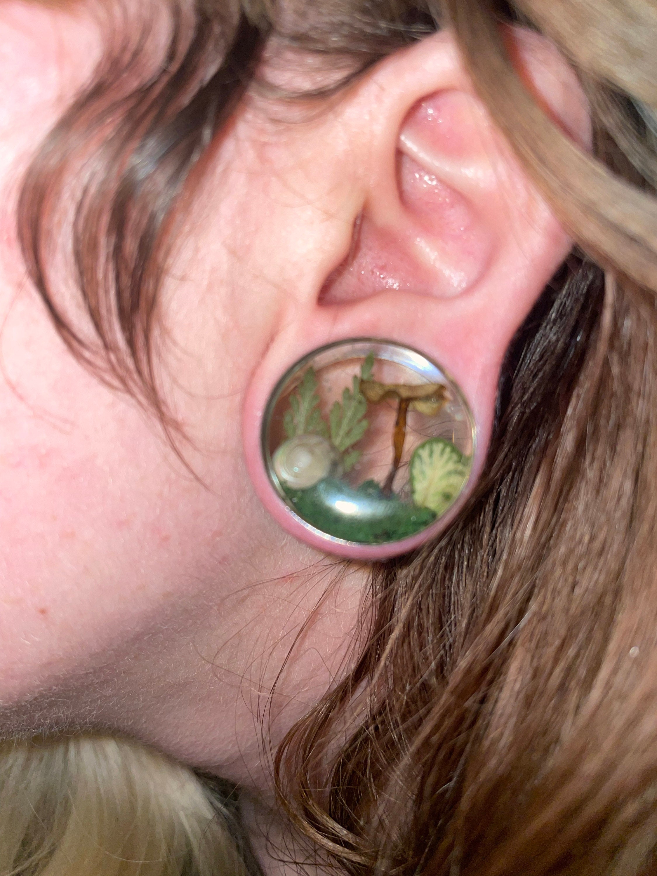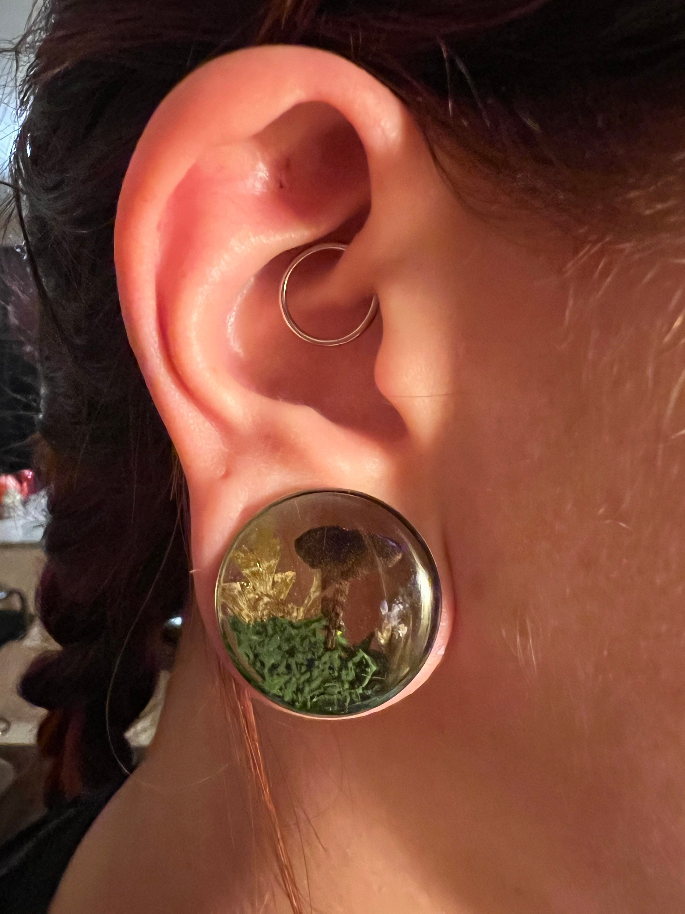 Enchanted forest, butterflies with real flowers and moss. Paper Butterfly in resin plugs, sizes 16mm and up.